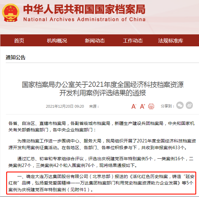 近日,國家檔案局發布了2021年度全國經濟科技檔案資源開發利用案例評選結果,由同方鼎欣協助大連萬達集團股份有限公司(北京總部)打造、申報的《活化紅色歷史檔案,鑄造“延安紅街”品牌,弘揚愛黨愛國精神——萬達集團檔案部門利用黨史檔案資源助力企業發展》從全國眾多申報案例中脫穎而出,經過初審和專家組綜合評議,作為唯一一家非公有制企業與其他四家國有企業案例一起入選五大慶祝建黨百年特別案例!這是對萬達集團在該案例中充分發揮留史存證、傳承文化重要作用的高度認可,也是對同方鼎欣在萬達集團檔案管理系統數字化改革中工作成果的積極肯定!