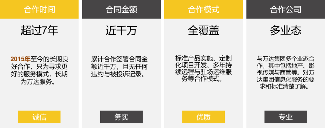 作為萬達集團資深信息化供應商,同方鼎欣團隊自2015年起服務至今,歷時已超過7年,已合作完成了十余項系統的開發、運維服務,達成了近千萬金額的合作,為萬達集團實現了多業態、全覆蓋的信息管理建設,實現了信息管理由傳統到現代、由封閉式到開放式的重要轉變,為萬達集團信息管理向數字化、智慧化管理轉型升級提供了重要的助力。