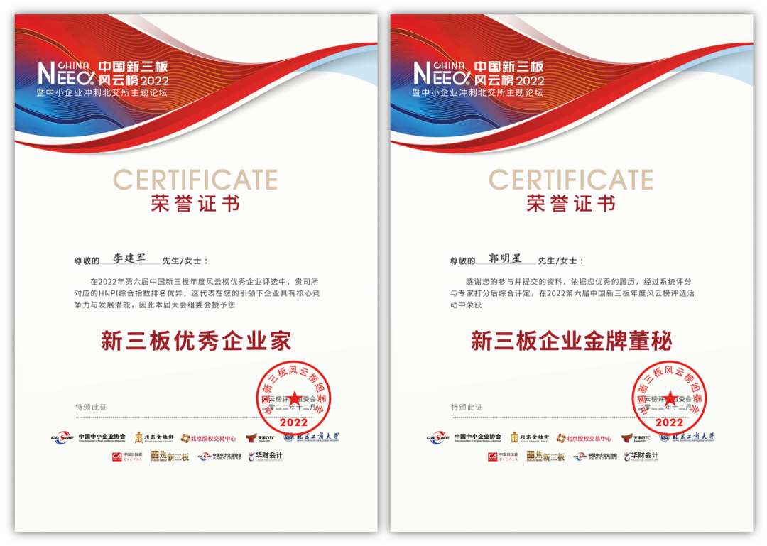 公司始終堅持誠信為本、持續創新,在打造核心競爭力過程中長期堅持發揚自主創新的精神,在開拓市場過程中始終實踐以客戶價值為核心的服務理念,以滿足客戶需求為己任,積極探索產業變革與業務增長模式、緊抓發展機遇與未來方向的戰略部署能力。此次公司成功獲得新三板年度風云榜“2022年最具投資價值企業”、“新三板優秀企業家”、“新三板優秀企業金牌董秘”三大獎項,正是憑借著公司多年來持續增長的經營規模、多年積淀的服務能力、研發能力和行業影響力。