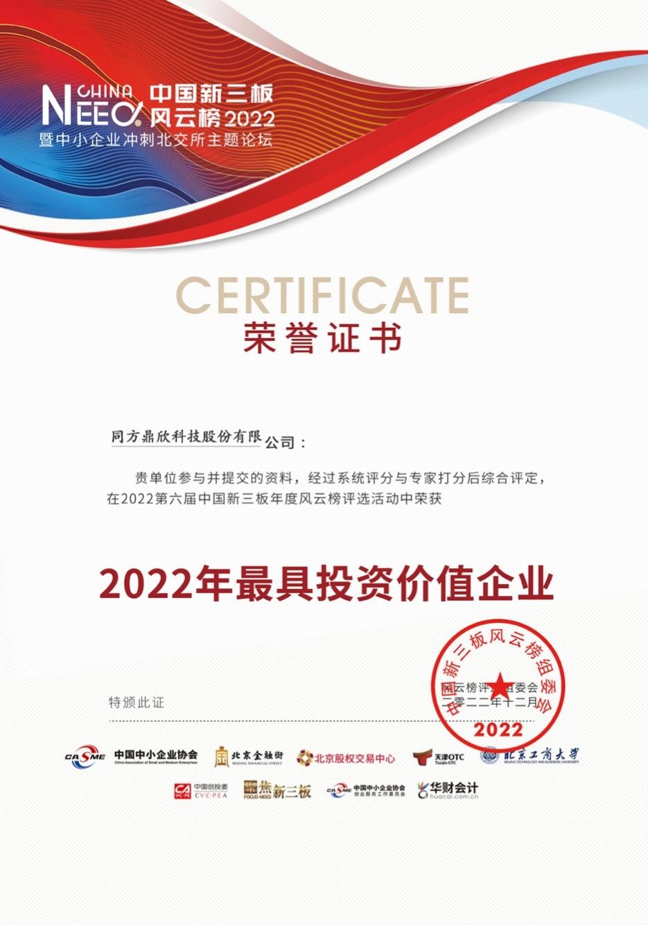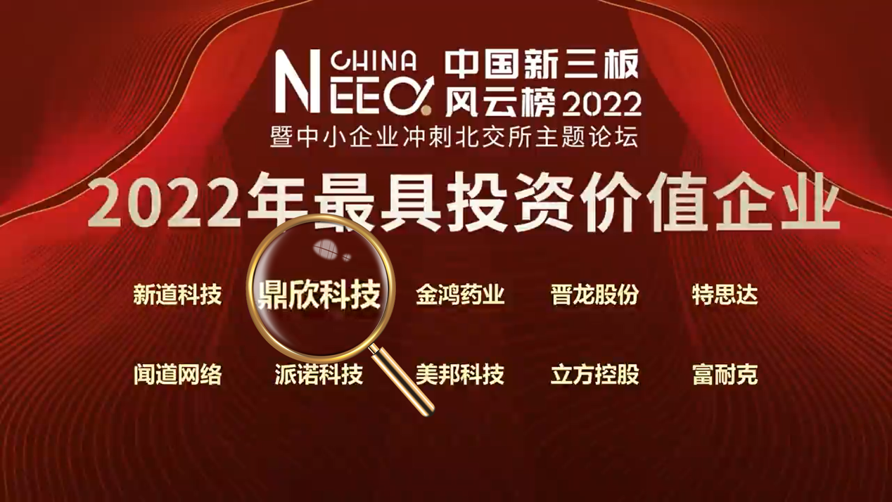 近日,“第六屆中國新三板年度風云榜2022暨中小企業沖刺北交所主題論壇”成功在京舉辦。會上公布了2022新三板風云榜及北交所投資者保護指數評選優秀榜單,同方鼎欣科技股份有限公司(證券簡稱:鼎欣科技,證券代碼:870840)作為新三板知名企業,在此次活動中獲評十大“最具投資價值企業“之一。同時,公司黨支部書記、總裁李建軍先生與公司副總裁、財務負責人、董事會秘書郭明星女士分別榮得“新三板優秀企業家”與“新三板企業金牌董秘”倆大個人獎項。