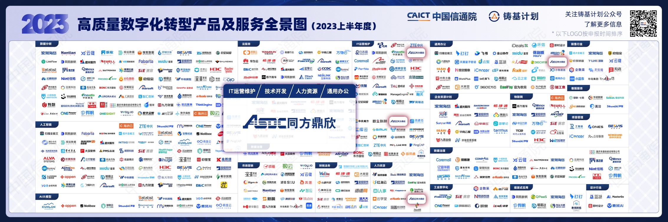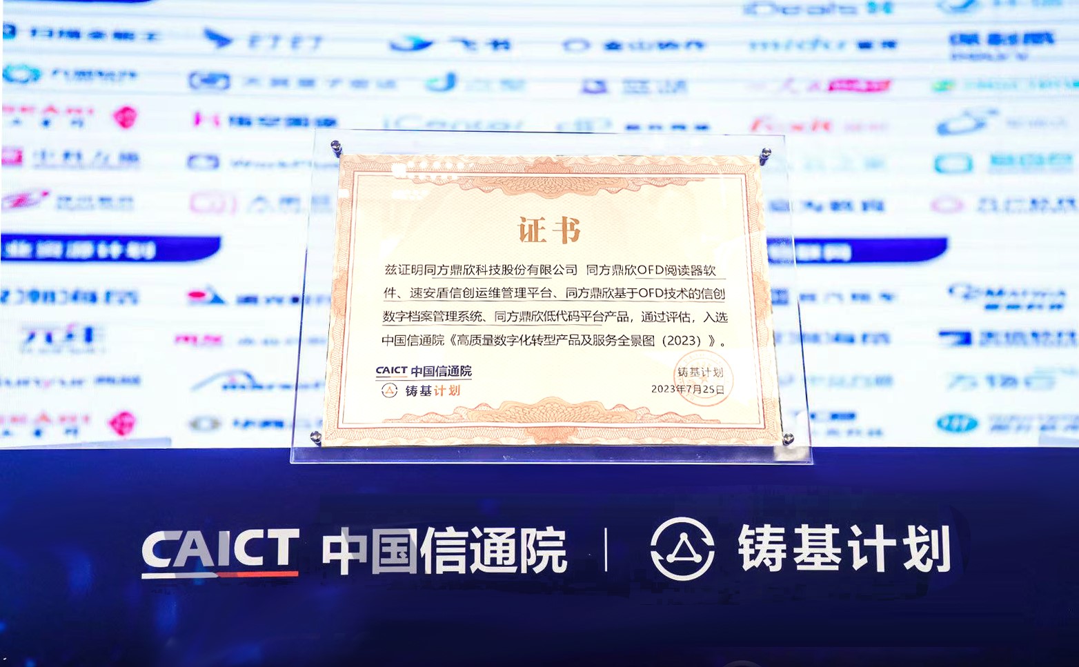 中國信息通信研究院是國家在信息通信領(lǐng)域(ICT)最重要的支撐單位以及工業(yè)和信息化部綜合政策領(lǐng)域主要依托單位,在國際國內(nèi)信息通信行業(yè)具有很高聲譽(yù)和影響力。本次大會期間,中國信通院隆重發(fā)布了《高質(zhì)量數(shù)字化轉(zhuǎn)型產(chǎn)品及服務(wù)全景圖(2023)》, 同方鼎欣憑借在產(chǎn)品創(chuàng)新、數(shù)據(jù)安全、互聯(lián)互通、服務(wù)質(zhì)量、用戶體驗(yàn)等多方面的優(yōu)異表現(xiàn)和助力企業(yè)數(shù)字化轉(zhuǎn)型方面的實(shí)踐成果,成功入選,同方鼎欣OFD閱讀器、速安盾信創(chuàng)運(yùn)維管理平臺、同方鼎欣基于OFD技術(shù)的信創(chuàng)數(shù)字檔案管理系統(tǒng)和同方鼎欣低代碼平臺分別收錄進(jìn)全景圖:“通用辦公”板塊、“IT運(yùn)營維護(hù)”板塊、“人力資源”板塊和“技術(shù)開發(fā)”板塊,為推動我國企業(yè)數(shù)字化轉(zhuǎn)型高質(zhì)量發(fā)展做出了有力貢獻(xiàn)!