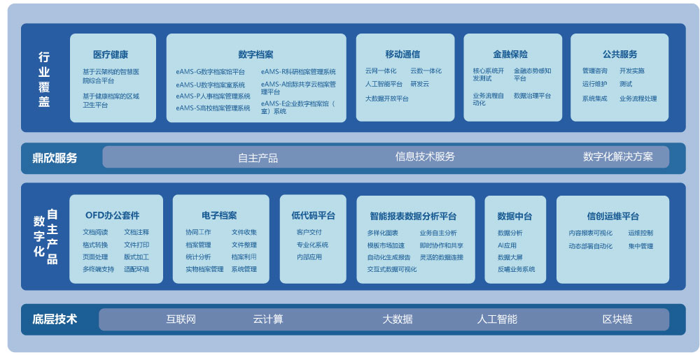 作為應(yīng)用型及技術(shù)型數(shù)商,鼎欣科技自1994年成立伊始,在信息產(chǎn)業(yè)領(lǐng)域已深耕30年,公司致力于成為中國(guó)領(lǐng)先的信息技術(shù)服務(wù)與數(shù)字化解決方案提供商。三十年來,公司業(yè)務(wù)發(fā)展迅猛,至今已覆蓋了全國(guó)50多個(gè)主要城市,現(xiàn)已成為覆蓋醫(yī)療健康、數(shù)字檔案、移動(dòng)通信、金融保險(xiǎn)、公共服務(wù)等眾多領(lǐng)域的解決方案服務(wù)商。經(jīng)過多年技術(shù)沉淀積累,公司已成為擁有全面的產(chǎn)品研發(fā)和技術(shù)創(chuàng)新能力的高新技術(shù)企業(yè),在信息技術(shù)服務(wù)領(lǐng)域積累了大量自主知識(shí)產(chǎn)權(quán),并通過全方位的信息技術(shù)服務(wù)助力客戶實(shí)現(xiàn)數(shù)字化轉(zhuǎn)型和升級(jí),成為了我國(guó)推進(jìn)行業(yè)數(shù)字化轉(zhuǎn)型的先行者之一。