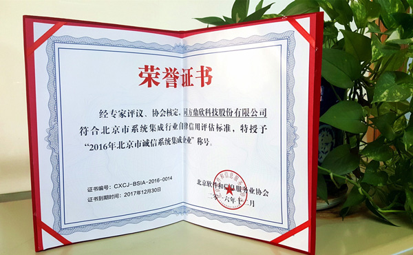 2016年北京市誠(chéng)信系統(tǒng)集成企業(yè)榮譽(yù)證書
