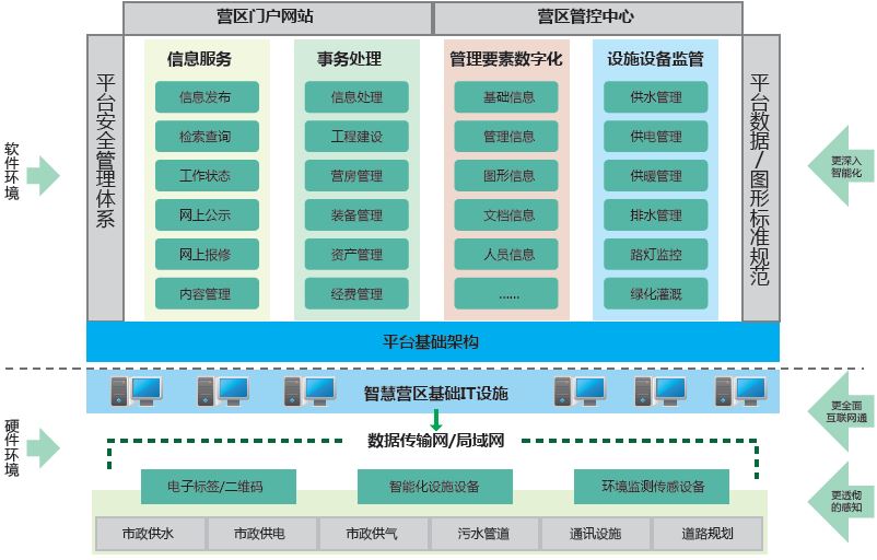 智慧營區(qū)精細(xì)化管理服務(wù)平臺是一套由軟件系統(tǒng)、專用物聯(lián)網(wǎng)、管控中心、數(shù)據(jù)采集及控制設(shè)備、信號傳輸線路、終端監(jiān)控設(shè)備(傳感器和執(zhí)行器)等組成的,實現(xiàn)了營區(qū)資產(chǎn)管理、營房部門的事務(wù)管理、營區(qū)設(shè)施的智能控制的一套整體解決方案。該平臺的應(yīng)用可以實現(xiàn)營區(qū)管理從事后管理轉(zhuǎn)變?yōu)樵搭^管理;從突擊管理轉(zhuǎn)變?yōu)殚L效管理;從專業(yè)部門管理轉(zhuǎn)變?yōu)榫C合管理;從人力手工管理轉(zhuǎn)變?yōu)橐劳鞋F(xiàn)代科技;從粗放經(jīng)驗型轉(zhuǎn)變?yōu)榫?xì)科學(xué)化;從評價主觀轉(zhuǎn)變?yōu)樵u價客觀。