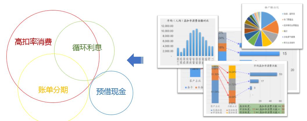 針對高扣率消費(fèi)、循環(huán)利息、賬單分期與預(yù)借現(xiàn)金四大類客戶行為進(jìn)行基本業(yè)務(wù)業(yè)務(wù)行為客群細(xì)分,詳細(xì)描述每一客群的特征表現(xiàn),進(jìn)行客戶畫像。
