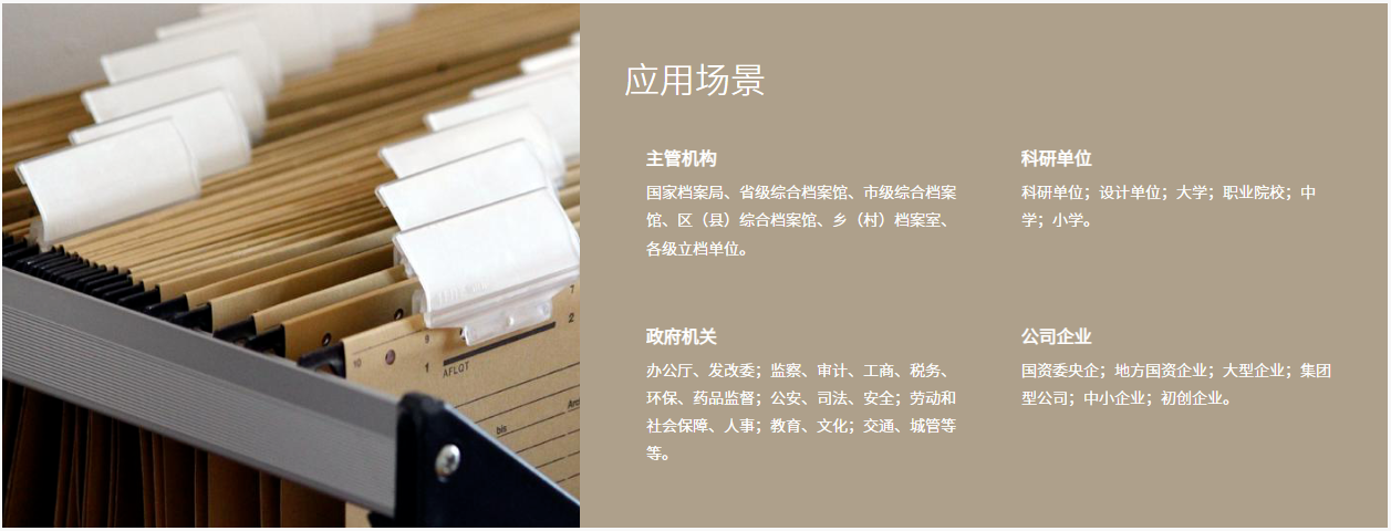 公司深耕檔案信息化領域,構建安全、自主、可控產品,依托國產化生態環境推動人工智能、區塊鏈、大數據和云計算等技術的創新運用,為各省市檔案局館、高校、科研院所、政府機關、企業集團等提供檔案咨詢及數字檔案館室/智慧檔案館/集成工程的建設與數據分析檢測、檔案SaaS平臺等全產業鏈檔案信息。