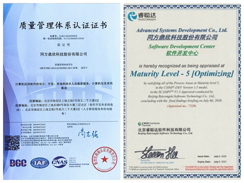 同方鼎欣于1999年通過了CMM L2的評(píng)估,是國(guó)內(nèi)第一家通過CMM評(píng)估的企業(yè),自2005年公司首次獲得ISO9001質(zhì)量安全認(rèn)證以來(lái),公司業(yè)務(wù)運(yùn)營(yíng)遵循著制度化、規(guī)范化、體系化的管理模式。公司圍繞質(zhì)量、環(huán)境以及職業(yè)健康安全建立了管理制度、操作程序文檔及記錄,嚴(yán)格實(shí)現(xiàn)了對(duì)內(nèi)嚴(yán)控質(zhì)量安全、建立風(fēng)險(xiǎn)管控機(jī)制,不斷推進(jìn)質(zhì)量標(biāo)準(zhǔn)體系建設(shè),對(duì)外以國(guó)家標(biāo)準(zhǔn)、行業(yè)標(biāo)準(zhǔn)為核心,確保服務(wù)和產(chǎn)品高質(zhì)量交付,實(shí)現(xiàn)穩(wěn)定的可持續(xù)發(fā)展。公司于2020年7月順利通過CMMI 5級(jí)評(píng)估,并將CMMI5級(jí)的各項(xiàng)標(biāo)準(zhǔn)應(yīng)用到項(xiàng)目管理及應(yīng)用開發(fā)的各個(gè)環(huán)節(jié),一如既往地堅(jiān)持對(duì)產(chǎn)品質(zhì)量和過程改進(jìn)的關(guān)注,并會(huì)將量化管理的思想融入企業(yè)管理和運(yùn)營(yíng)中,支持企業(yè)在研發(fā)管理、產(chǎn)品質(zhì)量和過程能力上的全面提升,不斷革新技術(shù)、迭代產(chǎn)品,推出更成熟的解決方案和服務(wù),助力客戶數(shù)字化轉(zhuǎn)型。